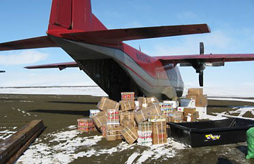 - unload the boxes from an airplane onto a sled, usually pulled by a snowmobile