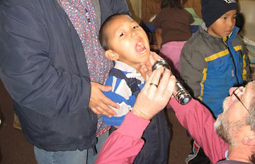 Don checks the teeth of a village student. The two often worked 18 hour days. |