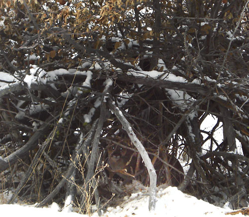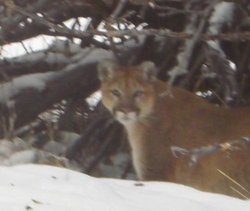 I’ve lived here 20 years and have only caught those glimpses. My daughters, however, have been more fortunate or maybe unfortunate to have had a much better look. In the winter of 2002-3 my daughter KC was out snowshoeing around the ranch on a beautiful sunny winter day with our two dogs. She had been out a couple of hours tromping around and decided to head home. Passing under a solitary pine tree for the second or third time. She happened to glance up to see a cougar stretched out in the sun watching her and the two dogs. She hurried home, spread the word and headed back with her camera. She was able to photograph the cougar up the tree.