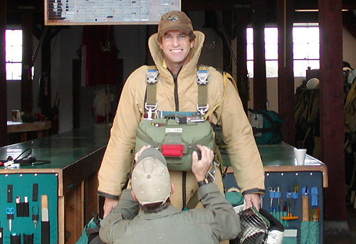 Dale Longanecker receives a spotter's check by former North Cascades Smokejumper Base Manager Steve Dickinson before boarding a smokejuper aircraft. Spotter's checks are done to ensure parachute equipment is in proper working order (USFS photo).
