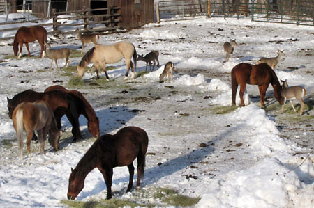The last big dump of snow brought an influx of deer, mostly white tails. Melton says the normally skittish white tails, not native to the valley, "hear the pickup coming and start jumping into the corral." - Photo by Sheela McLean