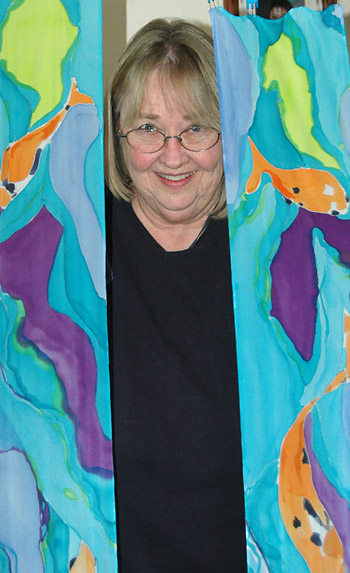 Patty today, framed by two of her hand-painted scarves.