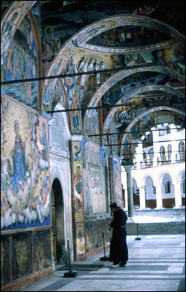 At the evening mass in the monastery church I was again reminded how far off the beaten path we had come. The church was a masterpiece of medieval Byzantine art and architecture. Its outside walls were entirely covered with fresco paintings of hundreds of saints, angels and scenes from the bible. The portraits included many Eastern Orthodox saints and local Bulgarian holy men.